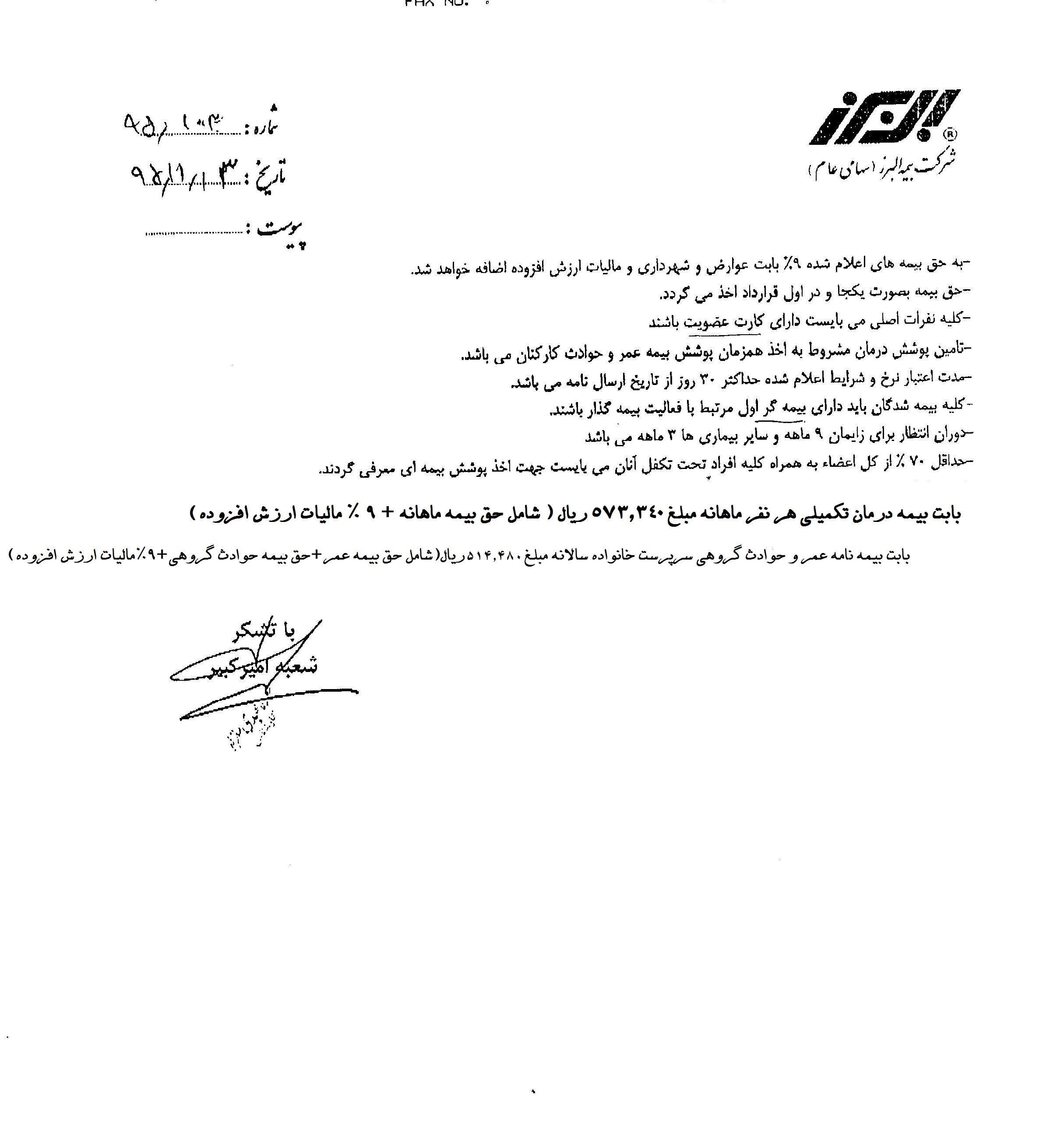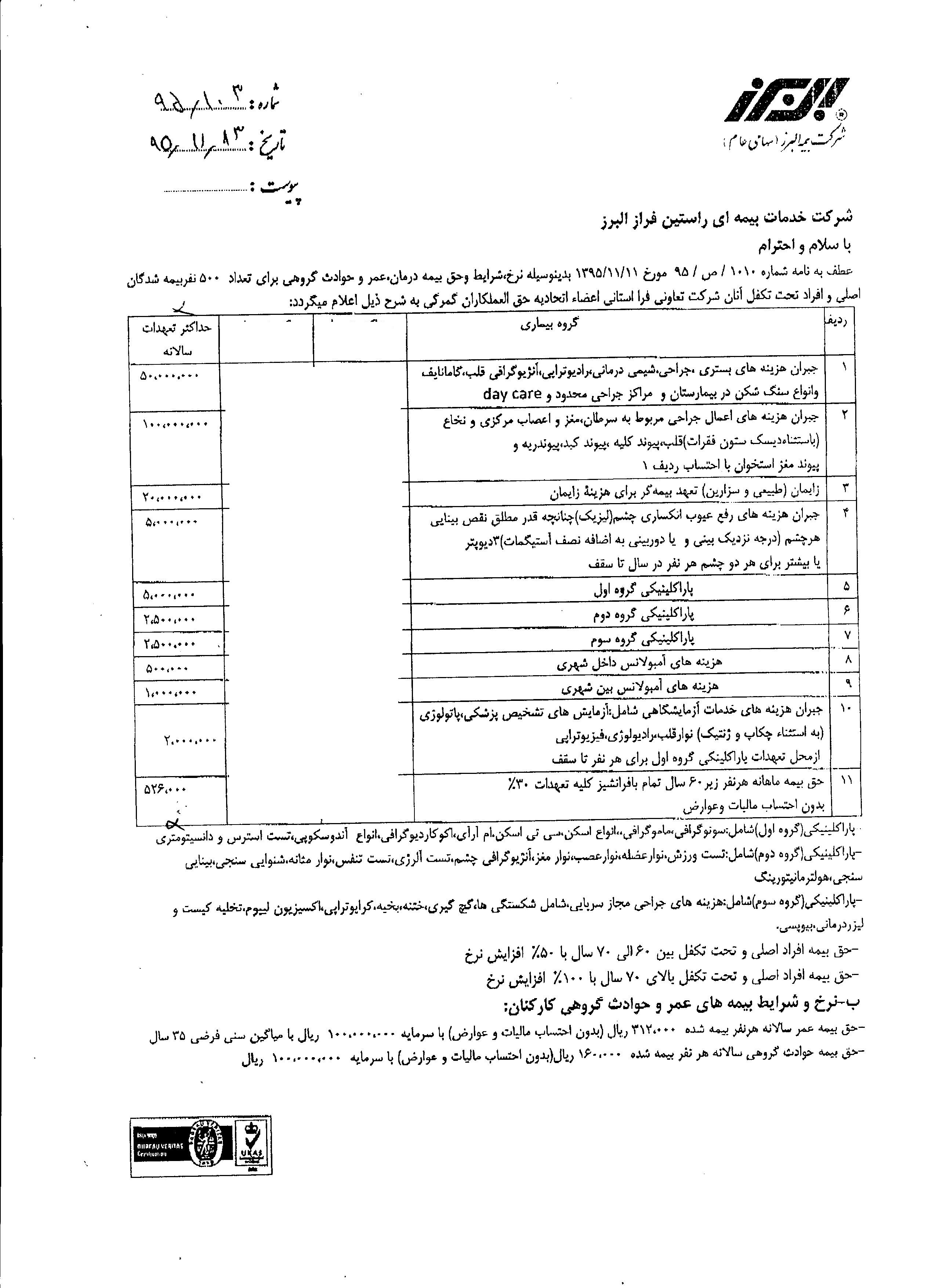 با پیگیری های مستمر هیات مدیره شرکت تعاونی فرا استانی اعضاء اتحادیه حق العملکاران گمرکی، قرارداد بیمه تکمیلی جهت رفاه حال کارگزاران رسمی گمرک ایران و شرکت بیمه البرز تنظیم گردیده است که به پیوست شرایط استفاده از این بیمه به اطلاع میرسد.
